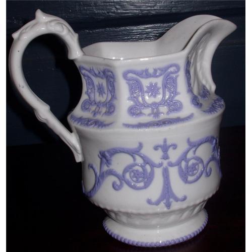 Rare English cream ware porcelain 1840's pitcher. This beautiful pitcher has raised lavender Empire NeoClassical scrolls all over the body. In good condition Height 7" 1/4 by 7".