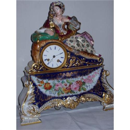 Museum quality rare Paris Porcelain Jacob Petit clock.This clock is a Jacob Petit Masterpiece!The clock has a surmounting of a lavishly decorated turbaned Turkish Sultana.She is reclining on a leopard skin chaise lounge resting one arm on a apple green pillow with raised gold gilt.This rare timepiece is beautifully modeled and painted in polychrome colors.The base on the front and back is festooned in beautifully painted garden blossoms.The clock also has in low relief all over anthemions. medallions Rococo Revival shell and scrolls. Marked in under glazed blue J.P. under the clock. Condition some wear to gold gilt repaired left foot. Height 16" 1/2 by 15".