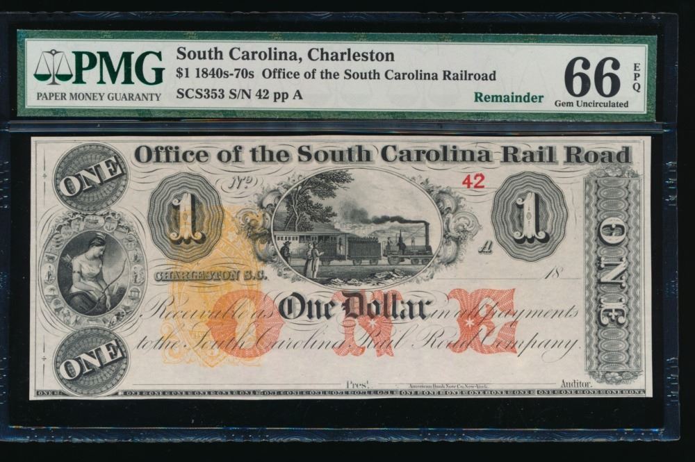 One 1840s-70s $1 Charleston SC Obsolete Note PMG 66EPQ.