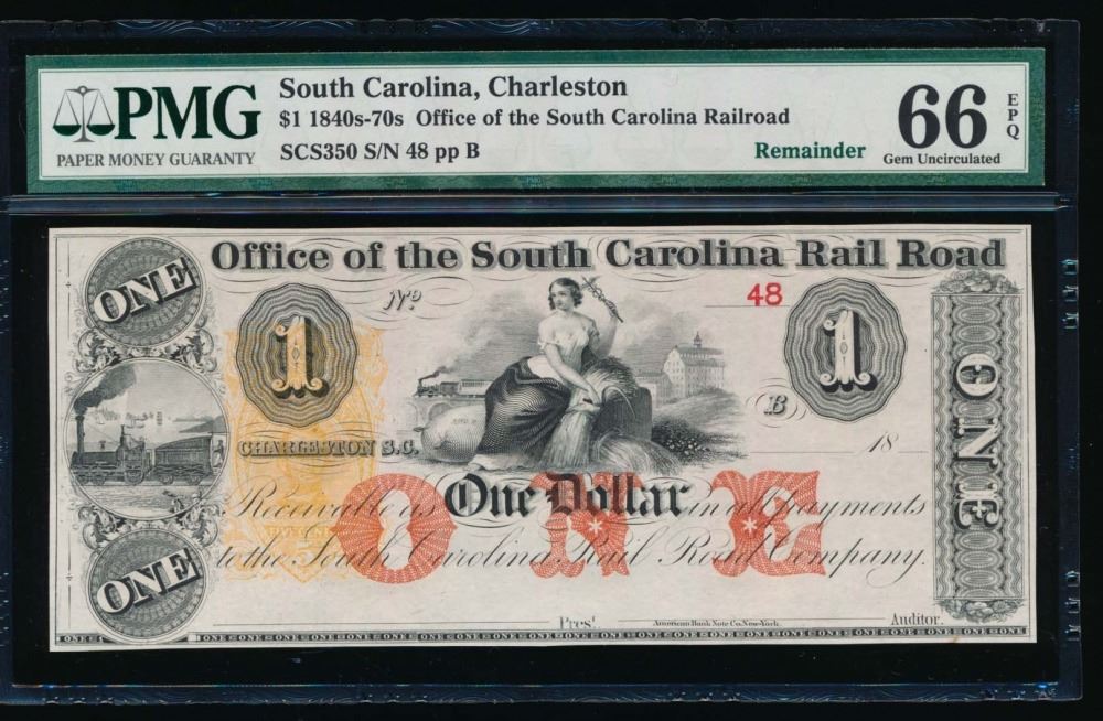 One 1840s-70s $1 South Carolina RR Obsolete Note PMG 66EPQ.