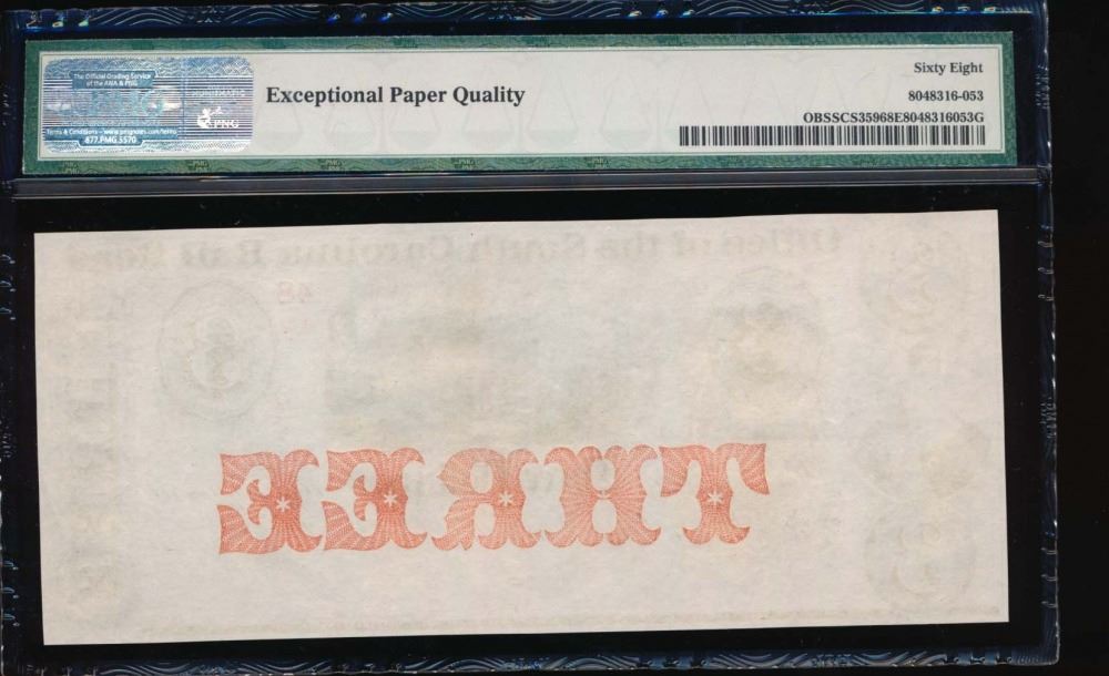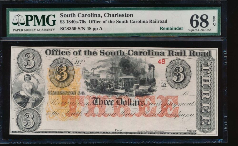 One 1840s-70s $3 South Carolina Railroad Obsolete Note PMG 68EPQ.