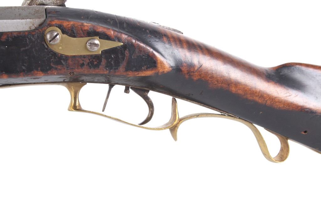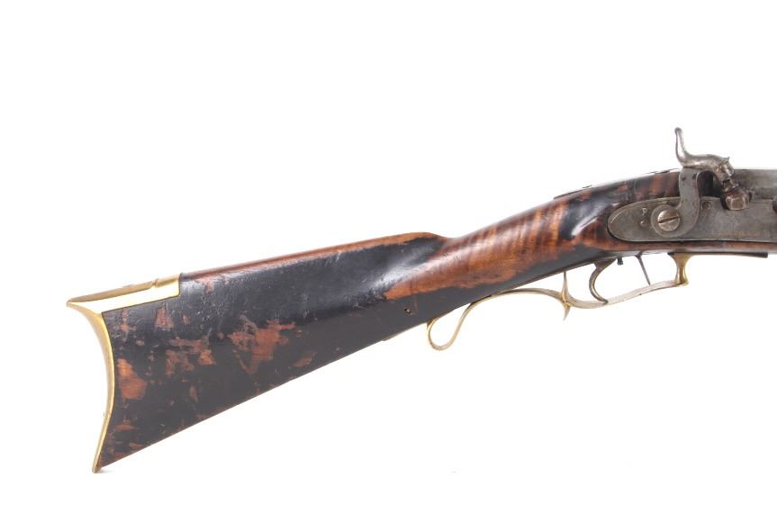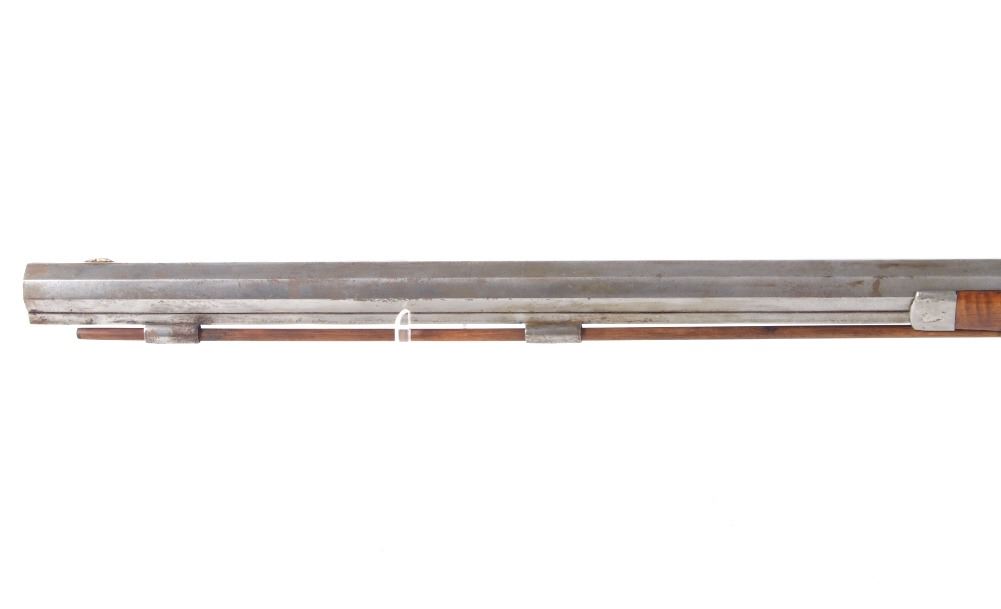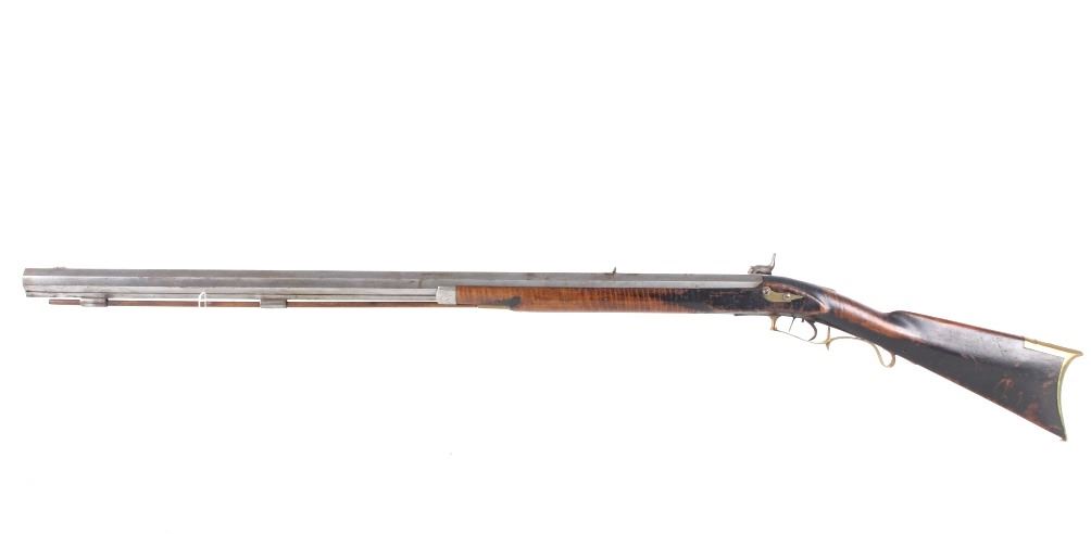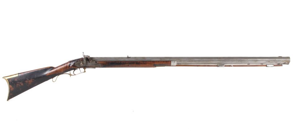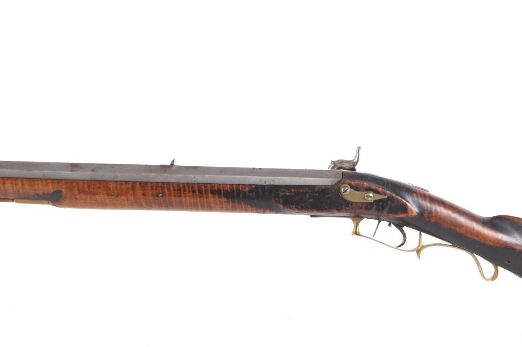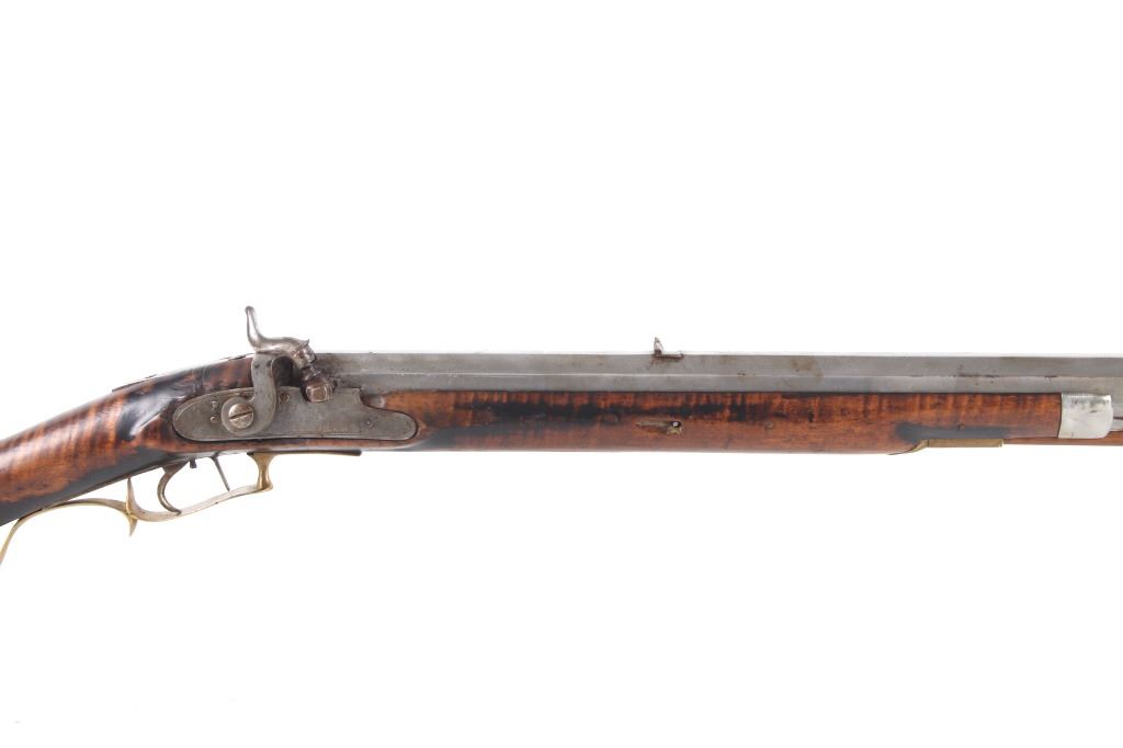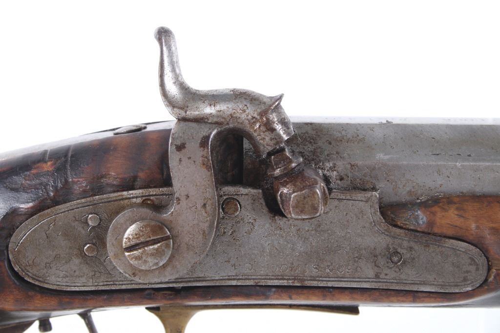 Featured in this lot we have a E. D. Loomis & Co. of Dayton, Ohio and James Cock Piqua, Ohio manufactured .48 caliber percussion cap single shot rifle originating from the mid 1800's. This is a circa 1840's percussion kentucky long rifle with large heavy octagon barrel and high grade wood. The rifle shows a heavy 34 3/4" long octagonal barrel, high grade tiger maple stock, percussion cap hammer and lock plate, and brass trigger guard and butt plate. The top of the barrel is marked "J. Cock Piqua O." with the barrel showing a bright finish. The lock plate shows faint vine etching and marked "E. D. Loomis & Co". The maple stock displays some light wear from use and a dark paint or tar finish. The rifle shows a good working action and double trigger system. The rifle is in good condition overall with some wear and rust due to age and use. No Serial Number. This firearm qualifies as an Antique, and does not require FFL Transfer or NICS Background Check.