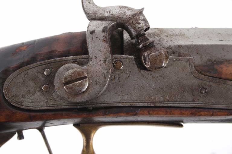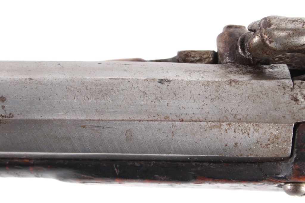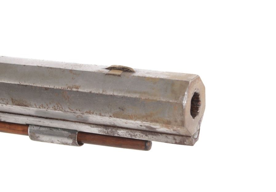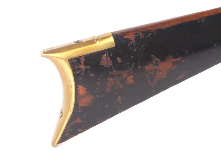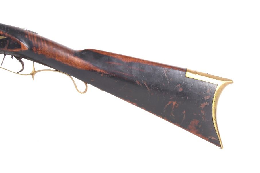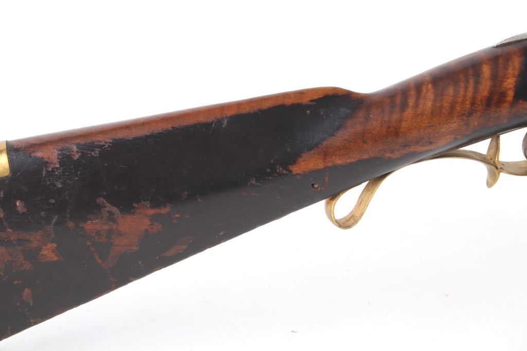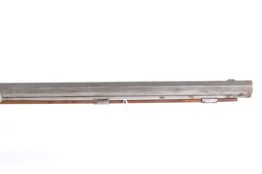 Featured in this lot we have a E. D. Loomis & Co. of Dayton, Ohio and James Cock Piqua, Ohio manufactured .48 caliber percussion cap single shot rifle originating from the mid 1800's. This is a circa 1840's percussion kentucky long rifle with large heavy octagon barrel and high grade wood. The rifle shows a heavy 34 3/4" long octagonal barrel, high grade tiger maple stock, percussion cap hammer and lock plate, and brass trigger guard and butt plate. The top of the barrel is marked "J. Cock Piqua O." with the barrel showing a bright finish. The lock plate shows faint vine etching and marked "E. D. Loomis & Co". The maple stock displays some light wear from use and a dark paint or tar finish. The rifle shows a good working action and double trigger system. The rifle is in good condition overall with some wear and rust due to age and use. No Serial Number. This firearm qualifies as an Antique, and does not require FFL Transfer or NICS Background Check.