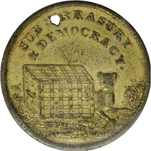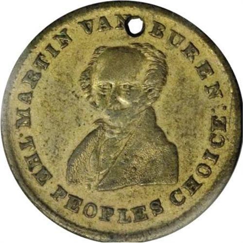 <B>1840s Martin Van Buren Political Token.</B></I> Brass, 23 mm. L-57, HT-76, DeW. MVB 1840-7, R.6. A lightly struck example with weakness in the center of the obverse, but with a strong reverse. From the John J. Ford, Jr. collection, Part 4, lot 122, where it was described as choice Very Fine. We think it might grade a bit higher. This rare token is one of the most sought-after Hard Times tokens, missing from most collections. The current Rulau catalog value is $2,600 in VF and $3,500 in XF. <BR><I>Ex: F.C.C. Boyd Estate; John J. Ford, Jr. collection.</B></I><BR><BR><b>Shipping:</b> Coins & Currency (<a target="_blank" href="http://www.heritageauctions.com/common/shipping.php">view shipping information</a>)
