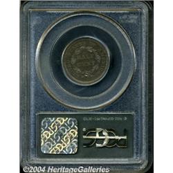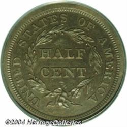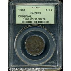 <B>1841<1/2 C> Original PR63 Brown PCGS.</B></I> Breen-1, R.6. Die State III, with a slender die crack along the upper left obverse border. The 1841 Half Cent is the second date in a series of proof-only issues that ended in 1849, when business strike production resumed. Like the other proof issues from the 1840s, the 1841 is divided into Original and Restrike varieties, which are promptly distinguished by the size and shape of the wreath berries. Originals have large, round berries, and the Restrikes feature smaller, pellet-shaped berries. This needle-sharp and attractively preserved specimen displays deep ocean-blue, apple-green, and rose-violet hues when rotated beneath a light. Encapsulated in a prior generation green label PCGS holder. Population: 7 in 63, 8 finer (5/04).<BR><I>From The Velma & Bowie Lynch Collection, Part Four.</B></I> <BR><BR><B>Important notice:</B> Heritage usually auctions material at the rate of 200-250 lots per hour. On some occasions eBay Live bid software or the Internet may not be able to keep up with the pace of the auction. We recommend placing a realistic absentee bid now as insurance to avoid disappointment. Occasionally the auctioneer may eliminate or reject an eBay Live bid, and the auctioneer may also reopen a lot after the close of the eBay live bidding (usually because we missed an audience bid), and may reject your bid even if it shows you as the winning bidder. By bidding via eBay Live, you agree that Heritage may award the lot to another bidder at its sole discretion under the circumstances described above or any other reasonable circumstances. Since eBay bids are not shown to us until we open the lot on the floor, we treat those bids just like floor bids. In most cases the floor responds before the eBay bid is presented to us, due to Internet lag time, so for consistency we have made it a policy that floor bids are always considered first over tie eBay live bids. Also please note that all Heritage lots purchased through eBay Live carry a 20% Buyer's Premium. Please make sure you read the Terms and Conditions before you bid. </span></font></tr></table></td></tr></table>