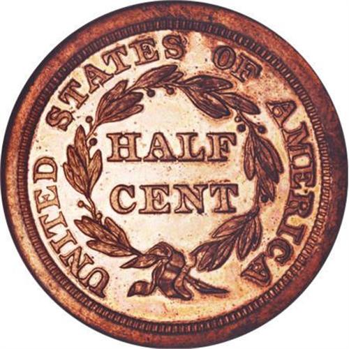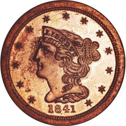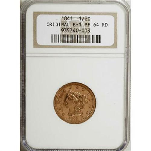 <B>1841 1/2 C Original PR64 Red NGC.</B></I> B-1, R.6. The Large Berries reverse, which identifies this specimen as an original proof, struck in or near 1841. It is roughly equal in rarity to the small berries restrike, which was coined sometime after half cent production ended in 1857 and collector demand arose for complete 1840 to 1857 proof sets. This razor-sharp near-Gem features bright pumpkin-orange and pastel rose surfaces. Essentially void of marks, and carbon is also minimal. NGC has certified just two pieces as Red, both in the PR64 grade (11/07). EAC PR60.<BR><BR><B>Coin Engraver:</B> Christian Gobrecht<BR><BR><b>Shipping:</b> Coins & Currency (<a target="_blank" href="http://www.heritageauctions.com/common/shipping.php">view shipping information</a>)