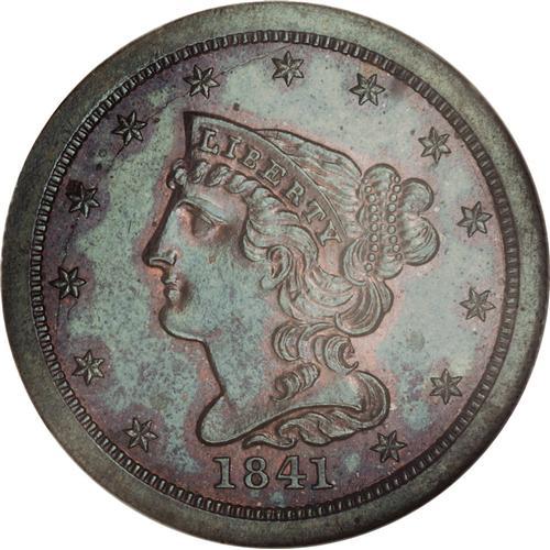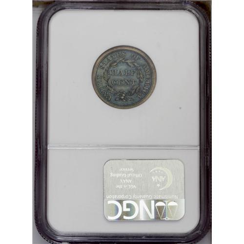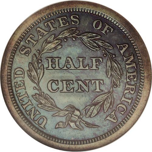 <B>1841<1/2 C> Original PR65 Brown NGC.</B></I> B-1, R.6. Die State III. Recognized as an original striking by the large berries on the reverse. The diagnostic die crack begins at the border adjacent to star 2, crosses stars 3 through 6 ,and ends at a point on the denticles above star 7. Originals from this year are considered R.6 and are among the most desirable of all proof half cents. Some two dozen specimens are believed to exist, perhaps six of these are impounded in museums with another four or five being impaired in varying degrees. This glassy, wide-rimmed specimen is draped in colorful blue and rose iridescent toning. Census: 5 in 65, 0 finer (3/06). EAC PR60. <BR><BR><B>Important notice:</B> Heritage usually auctions material at the rate of 200-250 lots per hour. On some occasions eBay Live bid software or the Internet may not be able to keep up with the pace of the auction. We recommend placing a realistic absentee bid now as insurance to avoid disappointment. Occasionally the auctioneer may eliminate or reject an eBay Live bid, and the auctioneer may also reopen a lot after the close of the eBay live bidding (usually because we missed an audience bid), and may reject your bid even if it shows you as the winning bidder. By bidding via eBay Live, you agree that Heritage may award the lot to another bidder at its sole discretion under the circumstances described above or any other reasonable circumstances. Since eBay bids are not shown to us until we open the lot on the floor, we treat those bids just like floor bids. In most cases the floor responds before the eBay bid is presented to us, due to Internet lag time, so for consistency we have made it a policy that floor bids are always considered first over tie eBay live bids. Also please note that all Heritage lots purchased through eBay Live carry a 20% Buyer's Premium. Please make sure you read the Terms and Conditions before you bid. This lot is being auctioned in conjunction with a live floor auction by Heritage Galleries & Auctioneers. All final auction and invoice information will be supplied by Heritage Galleries & Auctioneers, and all other information should be considered preliminary. Lot:233 <BR><BR><B>Winning Notification and Billing:</B> After the FINAL session in this auction is complete, Heritage will send e-mail and snail mail invoices. This process normally takes several days. All final auction and invoice information will be supplied by Heritage Galleries & Auctioneers, and all other information should be considered preliminary. <BR><BR>This auction will be conducted on a live auction floor and over the Internet through eBay Live. If you choose to place an absentee bid, please take a moment to <font color='#0000ff'><u><a href='http://pages.ebay.com/liveauctions/help/before/laabsentee.html'>learn how eBay Live absentee bidding works</a></u></font><font color='#000000'>