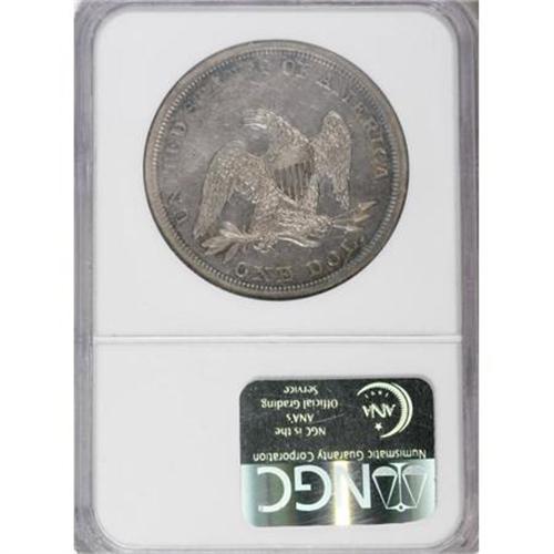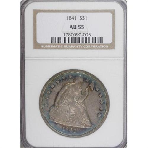 <B>1841 $1 AU55 NGC.</B></I> Well struck with light wear evident on the highpoints. The surfaces are modestly marked overall, and the still-lustrous fields display colorful bands of aqua, midnight-blue, magenta, and gold-orange color. A pleasing representative of this early Seated dollar.<BR><BR><b>Shipping:</b> Coins & Currency (<a target="_blank" href="http://www.heritageauctions.com/common/shipping.php">view shipping information</a>)
