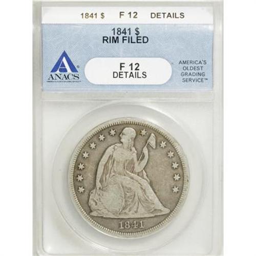 <B>1841 $1 --Rim Filed--ANACS. Fine 12 Details.</B></I> NGC Census: (1/158). PCGS Population (0/199). Mintage: 173,000. Numismedia Wsl. Price for NGC/PCGS coin in F12: $217. (#6927)<BR><BR><B>Coin Engraver:</B> Christian Gobrecht<BR><BR><b>Shipping:</b> Coins & Currency (<a target="_blank" href="http://www.heritageauctions.com/common/shipping.php">view shipping information</a>)