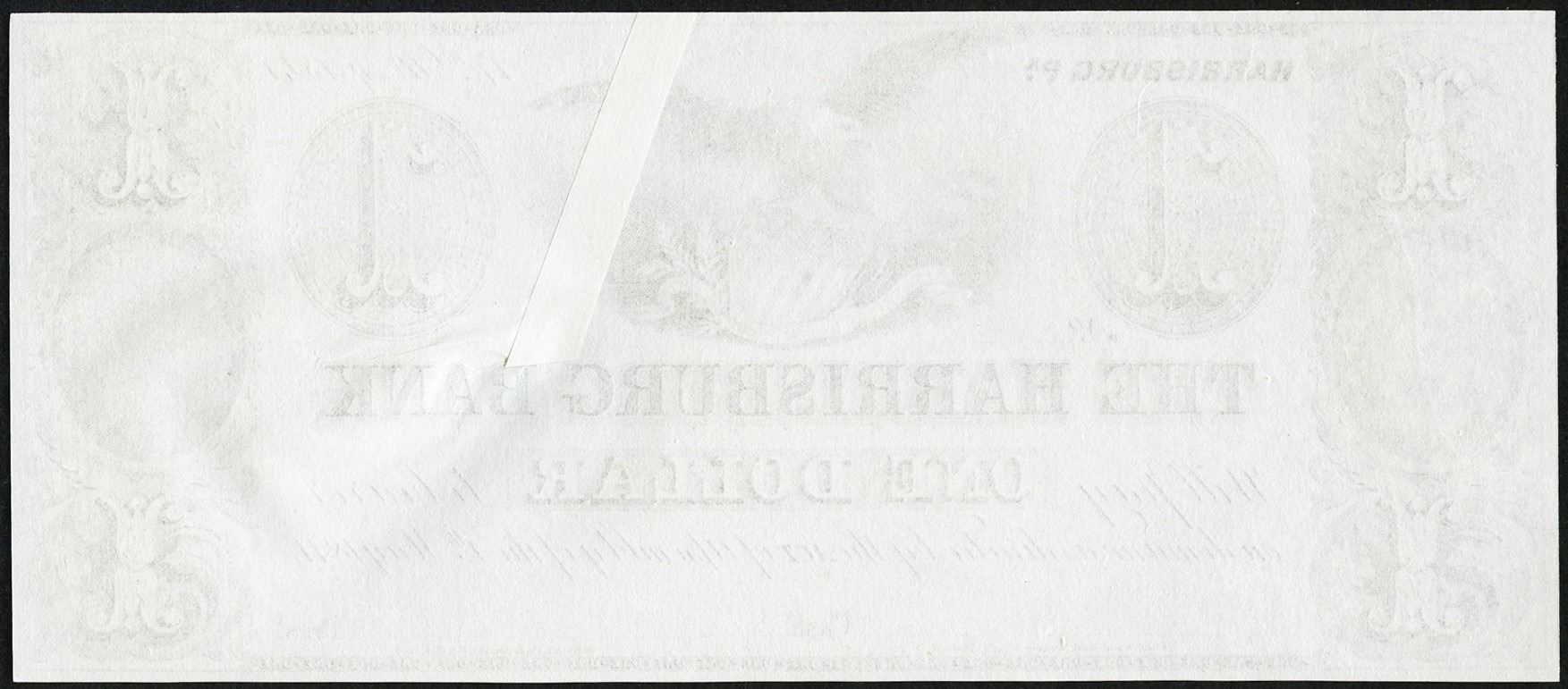 One 1841 $1 Harrisburg Bank Note. Large tape repaired tear on back.