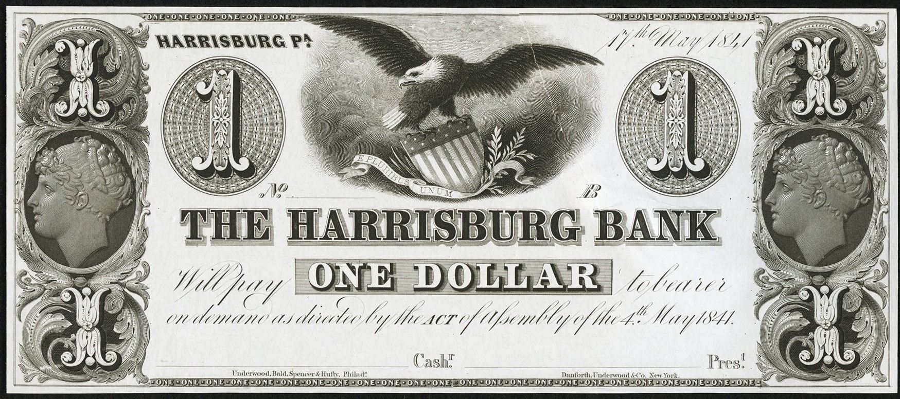 One 1841 $1 Harrisburg Bank Note. Large tape repaired tear on back.