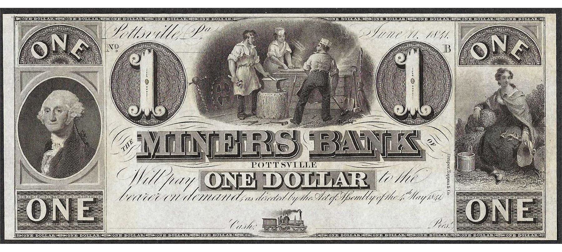 1841 $1 Miners Bank Pottsville, PA Obsolete Note