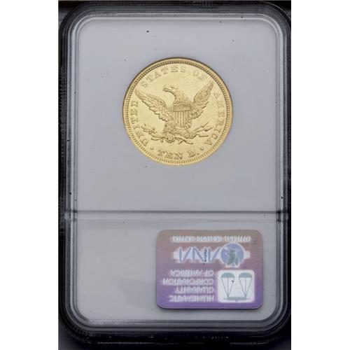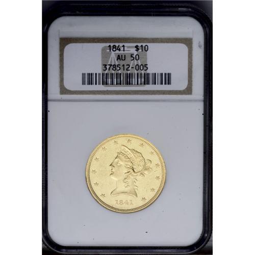 <B>1841<$10> AU50 NGC.</B></I> This coin exhibits appreciable prooflike surfaces around the peripheral stars and letters. Despite this, or perhaps because of it, numerous surface abrasions are evident on both obverse and reverse. Decidedly scarce nonetheless. Census: 23 in 50, 60 finer (3/06).<BR><I>From The Steve Glenn Collection.</B></I> <BR><BR><B>Important notice:</B> Heritage usually auctions material at the rate of 200-250 lots per hour. On some occasions eBay Live bid software or the Internet may not be able to keep up with the pace of the auction. We recommend placing a realistic absentee bid now as insurance to avoid disappointment. Occasionally the auctioneer may eliminate or reject an eBay Live bid, and the auctioneer may also reopen a lot after the close of the eBay live bidding (usually because we missed an audience bid), and may reject your bid even if it shows you as the winning bidder. By bidding via eBay Live, you agree that Heritage may award the lot to another bidder at its sole discretion under the circumstances described above or any other reasonable circumstances. Since eBay bids are not shown to us until we open the lot on the floor, we treat those bids just like floor bids. In most cases the floor responds before the eBay bid is presented to us, due to Internet lag time, so for consistency we have made it a policy that floor bids are always considered first over tie eBay live bids. Also please note that all Heritage lots purchased through eBay Live carry a 20% Buyer's Premium. Please make sure you read the Terms and Conditions before you bid. This lot is being auctioned in conjunction with a live floor auction by Heritage Galleries & Auctioneers. All final auction and invoice information will be supplied by Heritage Galleries & Auctioneers, and all other information should be considered preliminary. Lot:3910 <BR><BR><B>Winning Notification and Billing:</B> After the FINAL session in this auction is complete, Heritage will send e-mail and snail mail invoices. This process normally takes several days. All final auction and invoice information will be supplied by Heritage Galleries & Auctioneers, and all other information should be considered preliminary. <BR><BR>This auction will be conducted on a live auction floor and over the Internet through eBay Live. If you choose to place an absentee bid, please take a moment to <font color='#0000ff'><u><a href='http://pages.ebay.com/liveauctions/help/before/laabsentee.html'>learn how eBay Live absentee bidding works</a></u></font><font color='#000000'>