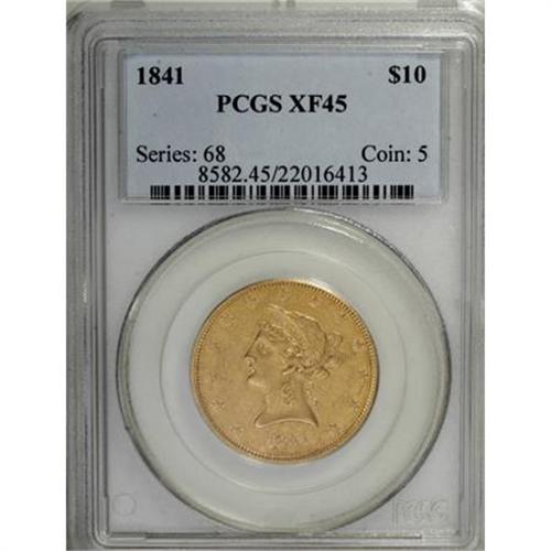 <B>1841 $10 XF45 PCGS.</B></I> . PCGS Population (32/45). NGC Census: (37/97). Mintage: 63,131. Numismedia Wsl. Price for NGC/PCGS coin in XF45: $798. (#8582)<BR><BR><B>Coin Engraver:</B> Christian Gobrecht<BR><BR><b>Shipping:</b> Coins & Currency (<a target="_blank" href="http://www.heritageauctions.com/common/shipping.php">view shipping information</a>)