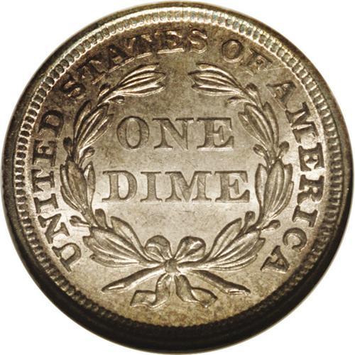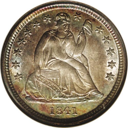 <B>1841<10C> MS65 <img border='0' src='http://www.heritagecoins.com/images/star.gif' width=10 height=10> NGC.</B></I> Fortin-102. The 1 in the date is lightly repunched. This assuredly struck and lustrous Gem is attractively toned in tawny-gold, sky-blue, and ruby tints. The present piece is the single finest certified 1841 half dime to receive a Star designation from NGC, although a total of six pieces have received higher grades without a Star designation.