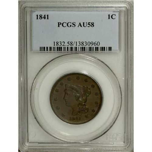 <B>1841 1C AU58 PCGS.</B></I> PCGS Population (5/24). NGC Census: (11/46). Mintage: 1,597,367. Numismedia Wsl. Price for NGC/PCGS coin in AU58: $250. (#1832)<BR><BR><B>Coin Engraver:</B> Christian Gobrecht<BR><BR><b>Shipping:</b> Coins & Currency (<a target="_blank" href="http://www.heritageauctions.com/common/shipping.php">view shipping information</a>\)