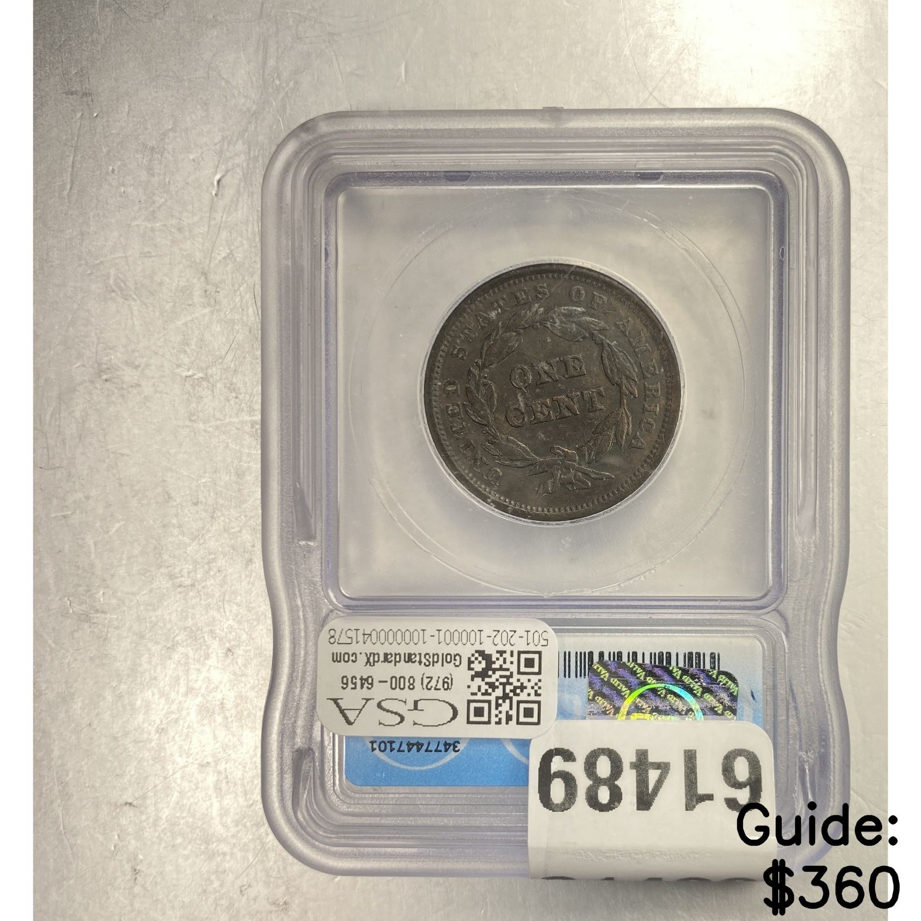 l. All non-certified coins and currency are guaranteed genuine, but are not guaranteed as to grade, since grading is a matter of opinion, an art and not a science, and therefore the description rendered by GSA or any third-party grading service may not agree with the opinion of others (including trained experts), and the same expert may not grade the same item with the same grade at two different times. GSA may, but is not obligated to, express an opinion as to non-certified numismatic items, in GSA’s opinion, or by its employees’ experience and the current interpretation of the American Numismatic Association’s standards as of the date the catalog was prepared. There is no guarantee or warranty expressed or implied that the grading opinions utilized by GSA, if any, will meet the standards of any grading service at any time in the future.
