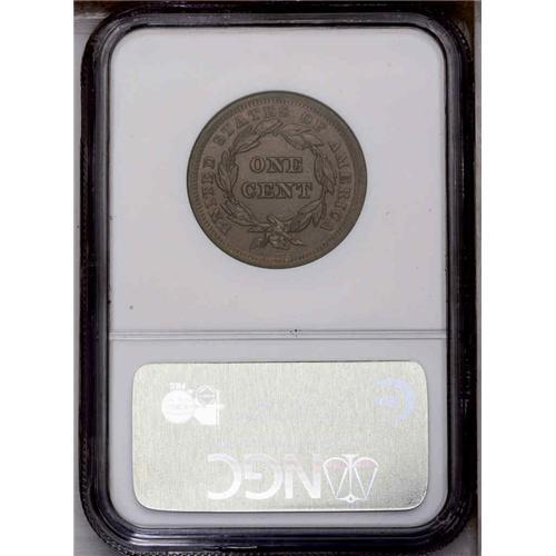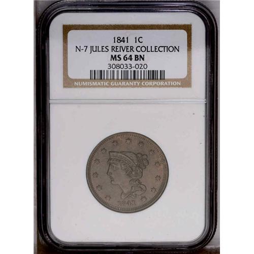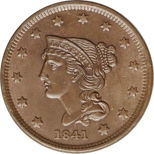<B>1841<1C> N-7, R.2. MS64 Brown NGC. XF45 EAC.</B></I> Grellman state a. Dull lumps beneath the 1 and 4 in the date and a die line from the nape of the neck are characteristic of the die pairing. A lustrous and suitably struck piece with tan-brown and medium brown toning. A few short bright pinscratches are present between 12 and 3 o'clock, and a couple of other terse marks are noted here and there.<BR><I>Ex: George Ramont</B></I> Envelope Included.