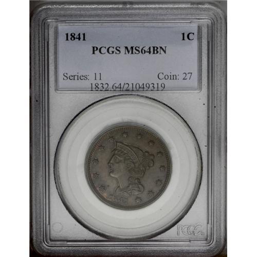 <B>1841<1C> MS64 Brown PCGS.</B></I> N-2, R.2. Die State a. Intermingled olive and steel-brown with lilac overtones and traces of original mint color close to the devices on both sides. This is an early die state with die lumps visible near the date. Not a Condition Census example, but clearly nicer than most that are known. EAC 55. <BR><BR><B>Important notice:</B> Heritage usually auctions material at the rate of 200-250 lots per hour. On some occasions eBay Live bid software or the Internet may not be able to keep up with the pace of the auction. We recommend placing a realistic absentee bid now as insurance to avoid disappointment. Occasionally the auctioneer may eliminate or reject an eBay Live bid, and the auctioneer may also reopen a lot after the close of the eBay live bidding (usually because we missed an audience bid), and may reject your bid even if it shows you as the winning bidder. By bidding via eBay Live, you agree that Heritage may award the lot to another bidder at its sole discretion under the circumstances described above or any other reasonable circumstances. Since eBay bids are not shown to us until we open the lot on the floor, we treat those bids just like floor bids. In most cases the floor responds before the eBay bid is presented to us, due to Internet lag time, so for consistency we have made it a policy that floor bids are always considered first over tie eBay live bids. Also please note that all Heritage lots purchased through eBay Live carry a 20% Buyer's Premium. Please make sure you read the Terms and Conditions before you bid. This lot is being auctioned in conjunction with a live floor auction by Heritage Galleries & Auctioneers. All final auction and invoice information will be supplied by Heritage Galleries & Auctioneers, and all other information should be considered preliminary. Lot:296 <BR><BR><B>Winning Notification and Billing:</B> After the FINAL session in this auction is complete, Heritage will send e-mail and snail mail invoices. This process normally takes several days. All final auction and invoice information will be supplied by Heritage Galleries & Auctioneers, and all other information should be considered preliminary. <BR><BR>This auction will be conducted on a live auction floor and over the Internet through eBay Live. If you choose to place an absentee bid, please take a moment to <font color='#0000ff'><u><a href='http://pages.ebay.com/liveauctions/help/before/laabsentee.html'>learn how eBay Live absentee bidding works</a></u></font><font color='#000000'>