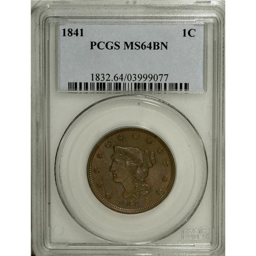 1841 1C MS64 Brown PCGS. N-7, R.2. An attractive piece