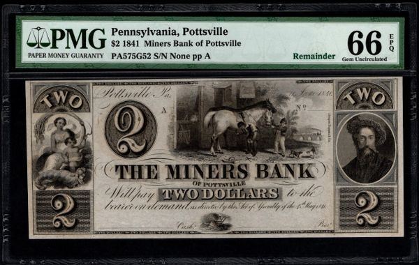 One 1841 $2 Pottsville PA Bank Note PMG 66EPQ.