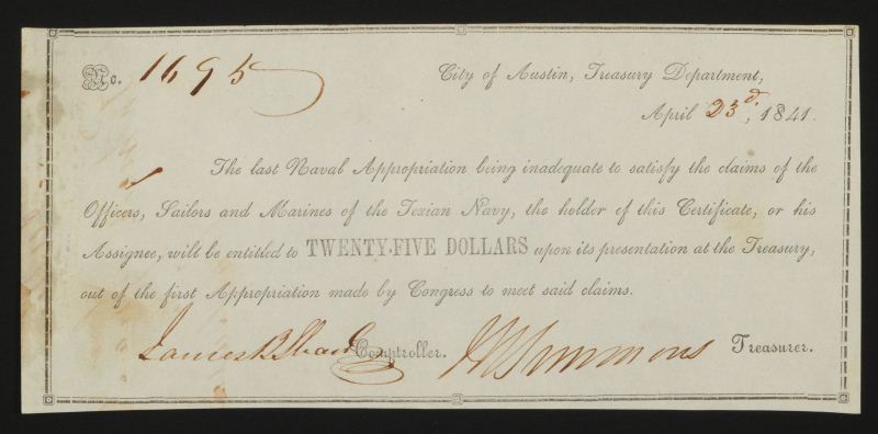 Reads: "The last Naval Appropriation being inadequate to satisfy the claims of the Officers, Sailors and Marines of the Texian Navy, the holder of this Certificate, or his Assignee, will be entitled to TWENTY-FIVE DOLLARS upon its presentation at the Treasury, out of the first Appropriatio made by Congress to meet said claims."
