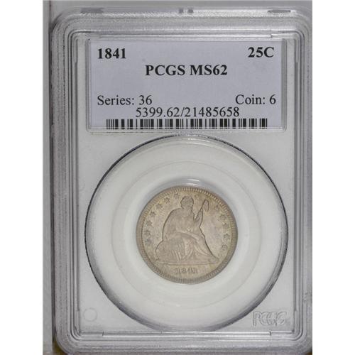 <B>1841<25C> MS62 PCGS.</B></I> Briggs 1-A. A satiny dove-gray and olive-gold example with clean surfaces and a decent strike. A short vertical pinscratch left of the 1 in the date identifies this piece. The low mintage 1841 is rarely seen in Mint State. UNITED STATES OF AMERICA exhibits strong die doubling toward the rim. Population: 2 in 62, 10 finer (2/06).