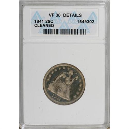 <B>1841 25C --Cleaned--ANACS. VF30 Details.</B></I> NGC Census: (2/33). PCGS Population (2/23). Mintage: 120,000. Numismedia Wsl. Price for NGC/PCGS coin in VF30: $175. (#5399)<BR><BR><B>Coin Engraver:</B> Christian Gobrecht<BR><BR><b>Shipping:</b> Coins & Currency (<a target="_blank" href="http://www.heritageauctions.com/common/shipping.php">view shipping information</a>\)