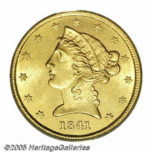 <B>1841<$5> MS64 PCGS.</B></I> This scarce, low mintage issue is represented at the upper end of the availability spectrum by some 15-20 coins that were discovered in a small hoard that entered the market in the 1950s. While not as scarce as its C and D-mint counterparts, the Philadelphia issue from this year is generally underrated by collectors and it is much scarcer than a No Motto type coin, especially above the AU level. This is a medium orange-gold example that shows impressive luster characteristics, brought about in part by the light die striations in the fields which impart a mildly reflective glow on each side. Sharply struck on all the design elements, the fields show a few small abrasions that keep this lovely piece from the Gem category. Population: 5 in 64, 0 finer (6/05).<BR><I>From The Melrose Bay Collection.</B></I>