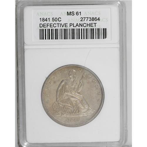 <B>1841<50C>--Defective Planchet--MS61 ANACS.</B></I> An apricot-gold representative with extensive satin luster and no obtrusive marks. Small pits (present on the planchet prior to strike) are present on Liberty's waist and upper shield. Another set of small pits beneath the beak have a smoothed appearance. A curly pinscratch lies between the wing and olive branch.
