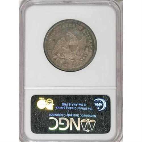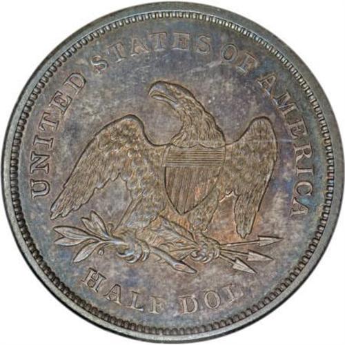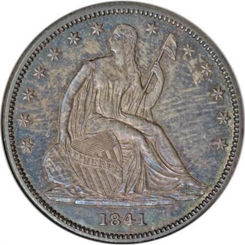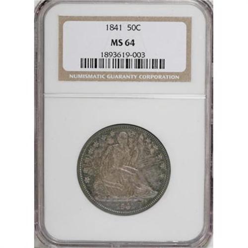 <B>1841 50C MS64 NGC.</B></I> Dense layers of electric-blue and brownish-gray patina adorn the two sides of this conditionally scarce near-Gem. Boldly struck and abrasion-free, with a fingerprint fragment in the right obverse field that may have limited the grade. Wiley and Bugert (1993) assign a rarity ranking of High R.6 to all varieties of this early issue, in Mint State. Census: 8 in 64, 4 finer (6/07). <BR><BR><B>Coin Engraver:</B> Christian Gobrecht<BR><BR><b>Shipping:</b> Coins & Currency (<a target="_blank" href="http://www.heritageauctions.com/common/shipping.php">view shipping information</a>\)