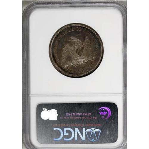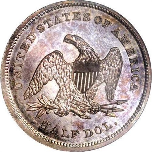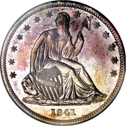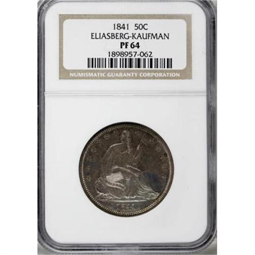<B>1841 50C PR64 NGC.</B></I> Ex: Eliasberg-Kaufman. Our roster suggests that about eight 1841 proof half dollars are known, mostly in the lower numeric range. The Kaufman specimen is probably second finest of those that are known. Randy Wiley and Bill Bugert, in their <I>Complete Guide to Liberty Seated Half Dollars</B></I>, write of the 1841 proofs that there are "less than 6 known." Similarly, in their description of the Louis Eliasberg, Sr. specimen, to which the present NGC-graded PR64 Phil Kaufman coin is pedigreed, Bowers and Merena say in their April 1997 catalog:<BR><BR>"Apparently about a half dozen Proofs are known, and quite possibly only four or five. Such pieces were mostly (but not entirely) issued as part of silver Proof sets in the year 1841, distributed to a very limited circle-probably not more than a dozen sets at best-and in the meantime widely dispersed. Later, as American numismatics became popular, a number of collectors desired to acquire Proofs of the 1840s, but most of this fascination was with half cents (which were rare in just about every account) and Proof Liberty Seated dollars. Generally, Proofs of the half dime, dime, quarter dollar, and half dollar were ignored or made in smaller quantities, and today these are far rarer than their dollar-sized cousins (which themselves are rare).<BR><BR>A total of seven 1841 proof half dollars have been certified by NGC and PCGS. NGC has graded three PR64 coins and one PR65, while PCGS has seen a PR61, a PR62, and a PR63.<BR><BR>The following is a roster of 1841 proof half dollars:<BR><B>1. Proof. </B></I>Smithsonian Institution.<BR><BR><B>2. Proof. </B></I>American Numismatic Society.<BR><BR><B>3. PR65 NGC.</B></I> James Kelly (privately, 1946; John Jay Pittman (David Akers, 10/1997, lot 1522, $44,000; Richmond Collection (David Lawrence, 3/2005), lot 1786, $47,150; American Numismatic Rarities (9/2005), lot 413; Goldberg Coins (2/2006), lot 1472, $55,200.<BR><BR><B>4. PR64 NGC.</B></I> <B>The present Kaufman piece. </B></I>John G. Mills (S. H. and H. Chapman, 4/1904); J.M Clapp; Clapp Estate (1942); Louis Eliasberg, Sr.; Eliasberg Estate (Bowers and Merena, 4/1997, lot 1919, $18,700.<BR><BR><B>5. PR64 NGC.</B></I> Superior (5/1990), lot 3803, $30,800.<BR><BR><B>6. PR62.</B></I> Charles A. Cass; Empire Collection (Stack's, 11/1957), lot 1352, $110; Reed Hawn (Stack's 8/1973), lot 137, $2,100; Auction'81 (RARCOA), lot 137, &1,550; Auction '90 (Stack's), lot 210, $8,800; Stack's (3/ 2007), lot 849.<BR><BR><B>7. PR62 PCGS.</B></I> Dr. R. H. Wilson; 1952 ANA (New Netherlands), lot 310; Elliot Landau (New Netherlands, 52nd Sale, 12/1958; lot 575; Dr. James O. Sloss (Bowers and Merena, 1/1999), lot 1137.<BR><BR><B>8. PR61 PCGS.</B></I> Bowers and Merena (7/2005), lot 550, $16,675.<BR><BR><B><I>Additional Appearances</B></I></B></I><BR><B>A. Proof.</B></I> David Golding (Stack's, 6/1952), lot 232.<BR><B>B. Proof. </B></I>Gustav Lichtenfels Collection (Kriesberg and Schulman, 2/1961), lot 2806. "Brilliant Proof. Sharp square edge. One of the very few in existence. Rare." Not plated.<BR><B>C. Proof. </B></I>Amwest (7/1981).<BR><B>D. Proof. </B></I>George H. Earle (H. Chapman, 6/1912), lot 2970.<BR><BR>On the reverse, several of the vertical lines in the shield extend entirely through the horizontals, to the top of the shield. Otherwise, both dies are exquisitely engraved.<BR><BR>Exquisite design definition is visible on the design elements of this lovely near-Gem proof example from the Eliasberg and Kaufman collections. Moreover, they are impressively highlighted by the deeply mirrored fields, standing out amidst them when the coin is rotated under a light source. Delicate powder-blue and lilac toning resides on each side, and the well preserved surfaces reveal just a few faint hairlines interspersed among die polish lines in the fields. The only pedigree marker that we can locate occurs on Liberty's right (left facing) arm above the elbow.<BR><I>From The Phil Kaufman Collection of Early Seated Proof Sets, Part Two.</B></I><BR><BR><B>Coin Engraver:</B> Christian Gobrecht<BR><BR><b>Shipping:</b> Coins & Currency (<a target="_blank" href="http://www.heritageauctions.com/common/shipping.php">view shipping information</a>)