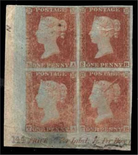 1841 1d plt 144 SW corner marginal block of four with plate No and part inscription, with faults but large margins all round and about 50% own gum, scarce item