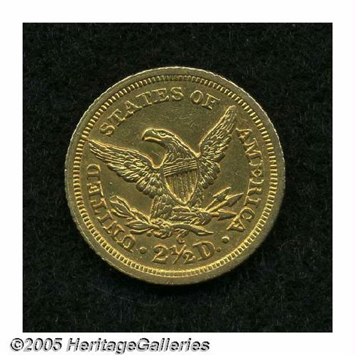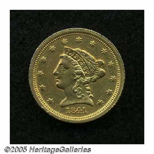 <B>1841-C<$2 1/2> AU50 Cleaned Uncertified.</B></I> Variety 2-B. A bold orange-gold example with subdued but abundant remaining luster. A horizontal pinscratch above the first star is of no concern, and in fact the surfaces are free from unpleasant marks or planchet problems. A scant 10,281 pieces were issued.