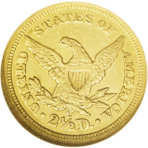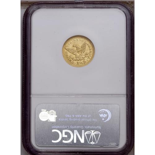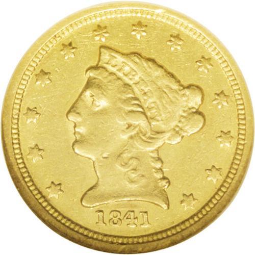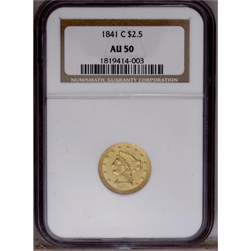 <B>1841-C<$2 1/2> AU50 NGC.</B></I> Variety 2-B. This early Charlotte Mint Liberty quarter eagle is from a low mintage of 10,281 pieces. Liberty's curls are softly impressed, customary for the issue, but the eagle has a pleasing strike. Luster glows from protected areas, and thorough evaluation of the light gold surfaces fails to locate mentionable marks.
