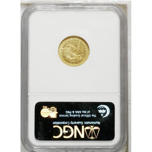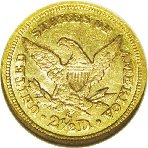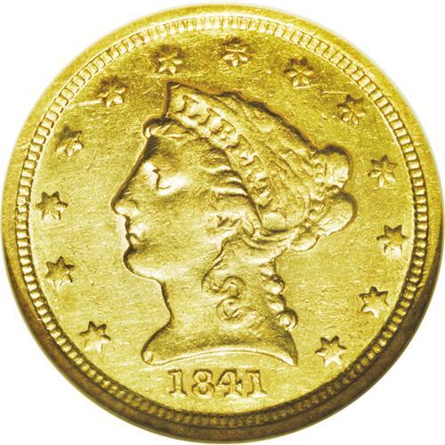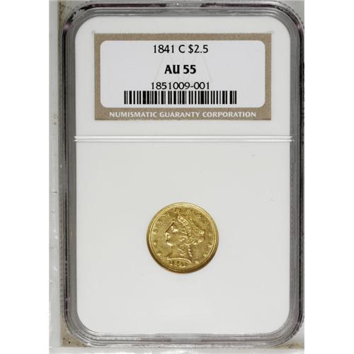 <B>1841-C<$2 1/2> AU55 NGC.</B></I> Variety 2-B. The 1841-C is one of the scarcest Charlotte quarter eagles. Only 10,281 pieces were struck, and only a small fraction of that number exist today. It is very seldom encountered in high grades, with seven coins currently certified in Uncirculated condition by NGC and PCGS. This piece is typically struck with pleasing yellow-gold coloration. There are two faint pinscratches to mention: one on the obverse that travels essentially along Liberty's jawline into the left obverse field, and one on the upper reverse field from the lower edge of E in STATES to the top of the eagle's head. Otherwise, the coin only shows a few wispy hairlines and tiny contact marks, along with minimal highpoint wear.