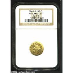 1841-C $2 1/2 AU58 NGC. Winter 2-B. The 1841-C is one of the rarest Charlotte Quarter Eagles. Only 10,281 pieces were struck and it is reliably estimated that today a mere 70-80 coins are extant in all grades. It is very seldom encountered in high grades with 8-10 coins believed known in AU with another 2-4 in Uncirculated condition. This piece is well struck throughout with bright yellow-gold coloration. It is very similar in grade and overall appearance to the AU58 in our 2001 Central States Sale. At first we thought they were the same coins as each has two defects in the field behind Liberty's neck. On this piece, there are two small oval-shaped planchet voids in that area, but this coin lacks the distinctive short scratch above the period to the right of the denomination on the reverse. At this level, this should be a lower Condition Census example of this important Charlotte issue.From the Ashland City Collection. Important notice: We expect to be auctioning lots at the rate of 200-250 per hour. Sometimes eBay Premier live bid software cannot keep up with that pace, so we strongly recommend that you place a realistic proxy bid now as insurance to avoid disappointment. Also please note that all Heritage/CAA lots purchased through eBay Premier carry a 20% Buyer's Premium. Please make sure you read the Terms and Conditions.