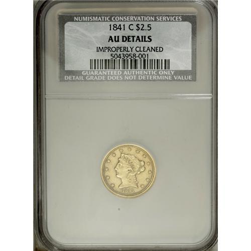 <B>1841-C $2 1/2 --Improperly Cleaned--NCS. AU Details.</B></I> Variety 2-B. As usually seen, the reverse detail is stronger than that of the obverse, which has a weak center. The subdued mustard-gold surfaces have light abrasions.<BR><BR><b>Shipping:</b> Coin/Currency (<a target="_blank" href="http://www.heritageauctions.com/common/shipping.php">view shipping information</a>)