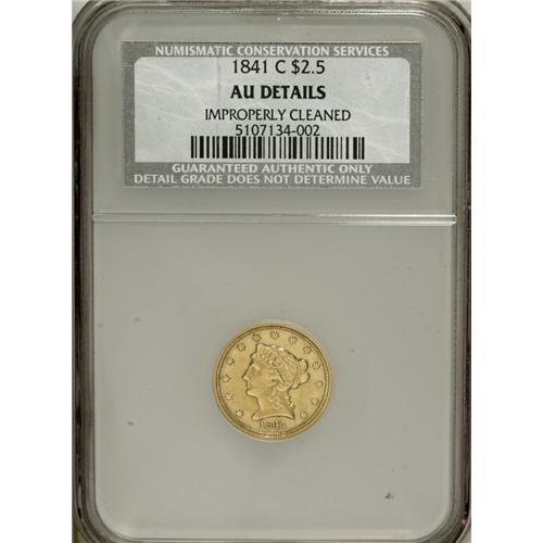 <B>1841-C $2 1/2 --Improperly Cleaned--NCS. AU Details.</B></I> Variety 2-B. This richly detailed yellow-gold Charlotte quarter eagle is overly bright and has numerous pinprick marks. A decent strike for this rare issue. The dies are widely rotated. Only 10,281 pieces were struck.<BR><BR><b>Shipping:</b> Coins & Currency (<a target="_blank" href="http://www.heritageauctions.com/common/shipping.php">view shipping information</a>)