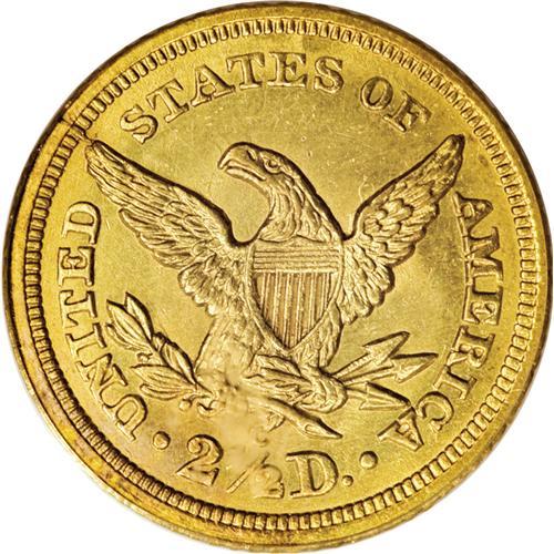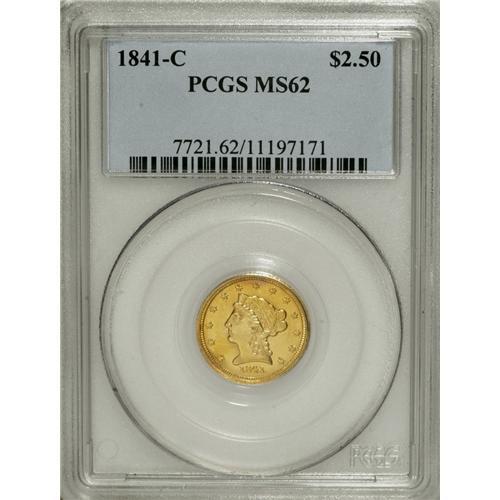 <B>1841-C $2 1/2 MS62 PCGS.</B></I> Variety 2-B, the only known dies. This is an important date in the quarter eagle, and examples from all three mints are scarce or rare, particularly the Philadelphia issue. Mintages totaled a small but unknown number from Philadelphia, a meager 4,164 coins from Dahlonega, and 10,281 pieces from the Charlotte Mint, including this example that is one of the few survivors in Mint State. Only three or four pieces actually exist in grades of MS60 or finer, including this piece, the John Pittman coin, and the Byron Reed specimen. The Harry Bass collection included just two examples of this issue, with the finest graded AU58.<BR> This is an impressive piece with brilliant green-gold luster and satiny surfaces. It is sharply struck, including full detail at the centers on each side. A few grade-limiting hairlines are evident, but the overall eye appeal is exceptional. Population: 1 in 62, 0 finer (3/07).<BR><BR><b>Shipping:</b> Coins & Currency (<a target="_blank" href="http://www.heritageauctions.com/common/shipping.php">view shipping information</a>)