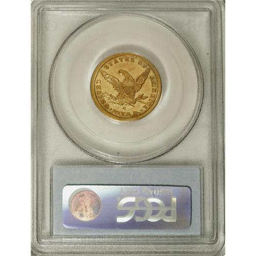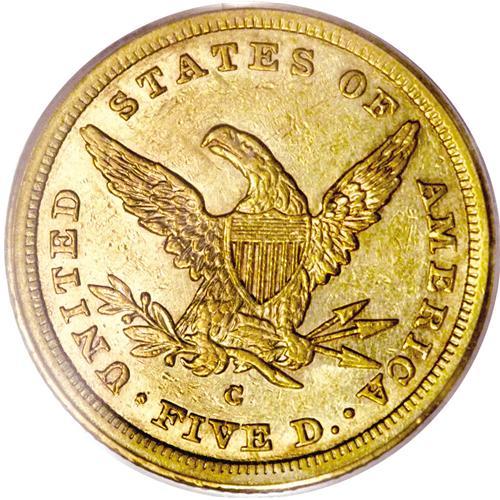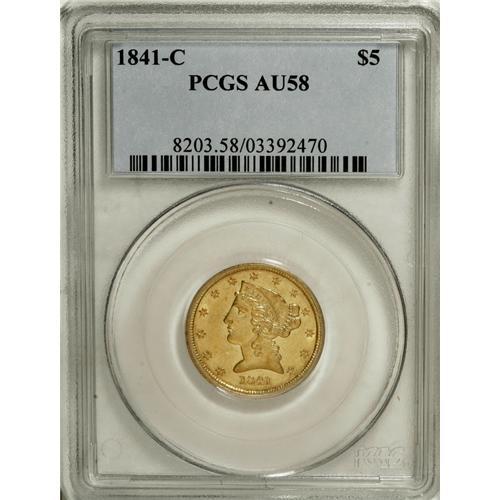 <B>1841-C $5 AU58 PCGS.</B></I> Variety 3-C. A lovely example of this early C-mint issue. The intricate strike belies its Charlotte Mint origin, and substantial mint luster beckons from the borders and devices. A pinscratch is noted southwest of the mintmark, but no other abrasions are worthy of discussion, and the preservation is attractive for the AU58 level. A mere 21,467 pieces were struck. Population: 8 in 58, 6 finer (3/07).<BR><BR><b>Shipping:</b> Coins & Currency (<a target="_blank" href="http://www.heritageauctions.com/common/shipping.php">view shipping information</a>)