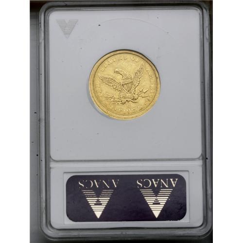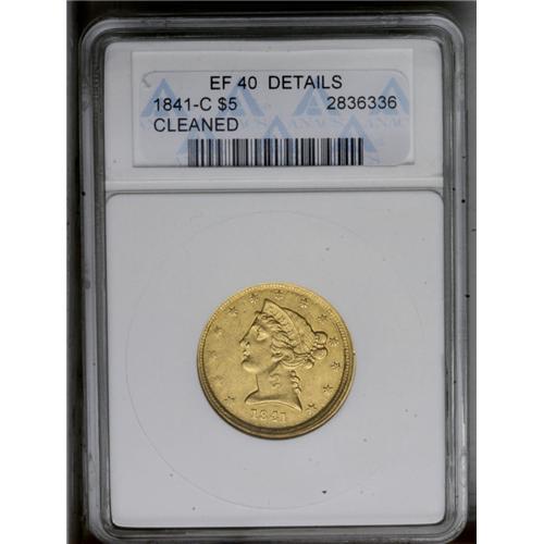 <B>1841-C<$5>--Cleaned--ANACS. XF40 Details.</B></I> Variety 3-C. This glossy lemon-gold Charlotte gold piece is softly struck on the left side stars and has a couple of small marks near the profile. The dies are misaligned toward 10 o'clock on the obverse and toward 2 o'clock on the reverse.