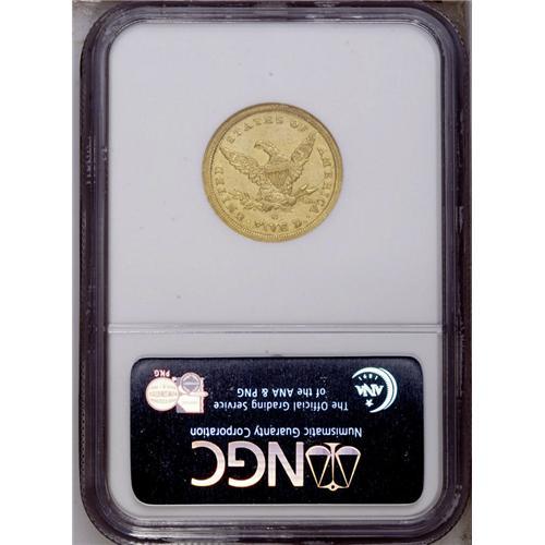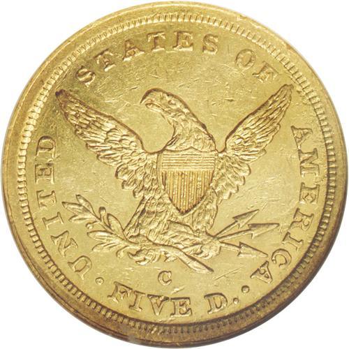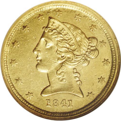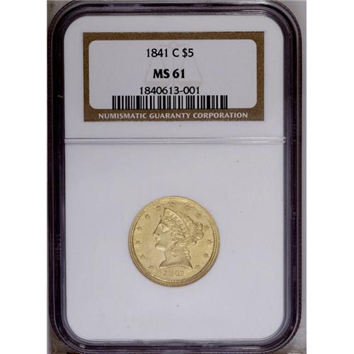 <B>1841-C $5 MS61 NGC.</B></I> Variety 3-C. The fourth half eagle struck at the Charlotte Mint, the 1841-C was produced to the extent of just 21,467 pieces. Surprisingly, this is one of the more common C-mint half eagles from the late 1830s and early 1840s, but it is still a significant rarity in Mint State. Winter ranks this date 17th in high grade rarity among C-mint fives, with AU-Mint State examples being more rare than those of the 1847-C, 1849-C, 1850-C, 1852-C, 1853-C, 1857-C, and 1858-C issues. In fact, with just five or six coins believed extant in Mint State (again, per Winter), the present example qualifies for lower Condition Census standing.<BR> This is a remarkably well struck coin for a product of the early Charlotte Mint. Every feature is boldly, if not sharply detailed. The surfaces alternate between yellow-gold and reddish-gold colors depending on the light angle, and neither side reveals more than the expected number of abrasions for the MS61 designation. Pedigree concerns compel us to mention a moderate reverse abrasion that is below the mintmark and above the E of FIVE.