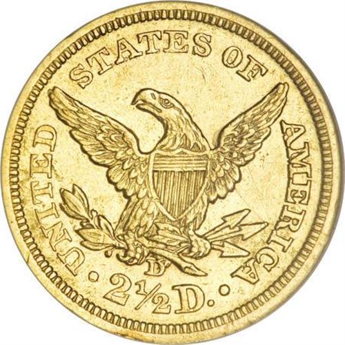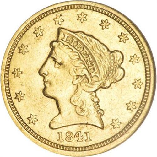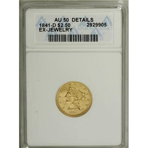 <B>1841-D $2 1/2 --Ex-Jewelry--ANACS. AU50 Details.</B></I> Variety 2-C. A rare Dahlonega Mint issue from a tiny mintage of 4,164 pieces. Well struck and partly lustrous, but slightly bent on the upper left field, and the obverse has a few scattered scratches. The rims lack any obvious problems. A bit bright from a mild cleaning.<BR><BR><B>Coin Engraver:</B> Christian Gobrecht<BR><BR><b>Shipping:</b> Coins & Currency (<a target="_blank" href="http://www.heritageauctions.com/common/shipping.php">view shipping information</a>)