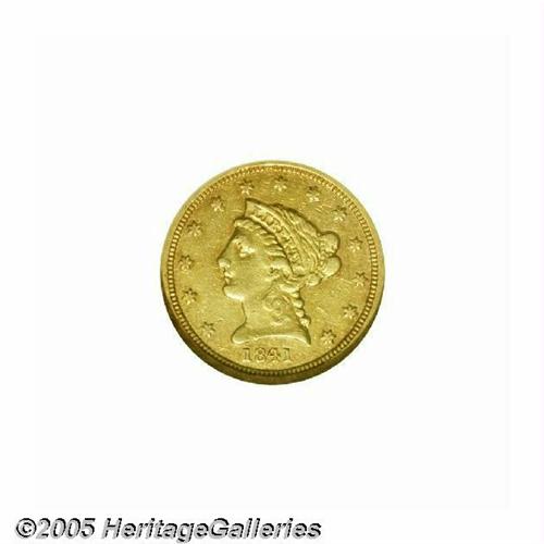 <B>1841-D<$2 1/2> AU53 NGC.</B></I> Variety 2-C. The 1841 Quarter Eagle struck at the Dahlonega Mint is among the most elusive of all dates in this series, especially in XF and finer grades. The mintage was 4,164 coins, and few of those have survived to this day. The actual survival rate is probably between 1% and 2%, or between 40 and 80 coins. The generally accepted figure is 55 coins known in all grades. Although moderately abraded, this is a lustrous example with lovely greenish-yellow gold color and hints of orange toning. The strike is typical with some central weakness, although most of the design elements are nicely defined. Population: 3 in 53, 15 finer (5/05).