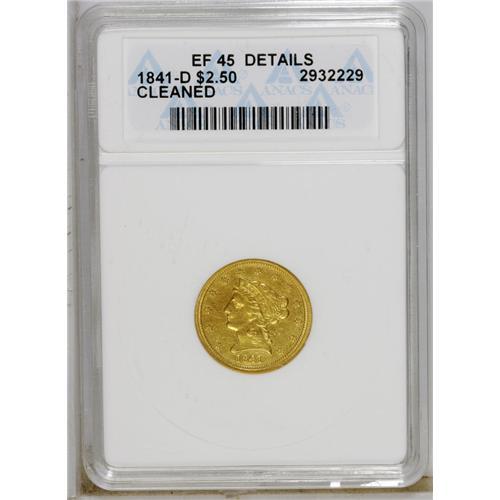<B>1841-D $2 1/2 --Cleaned--ANACS. XF45 Details.</B></I> Variety 2-D. A rare reverse variety of this difficult issue. Just 4,164 pieces were struck. Thickly hairlined, but the peripheral strike is bold, and the major devices are reasonably defined.<BR><BR><b>Shipping:</b> Coins & Currency (<a target="_blank" href="http://www.heritageauctions.com/common/shipping.php">view shipping information</a>)