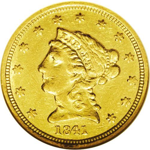 <B>1841-D<$2 1/2>--Tooled, Cleaned--ANACS. XF Details, Net XF40.</B></I> Variety 2-C. This is the usually seen variety for the year, with the mintmark positioned so that its lower left serif is over the 1 in the fraction. The other variety has the mintmark centered over the top of the fraction bar. Although not the rarest quarter eagle issue of the year (that honor belongs to the Philadelphia Mint issue), this date is elusive and always in demand. Just 4,164 of these coins were struck in Dahlonega, all on April 30, according to official records. Despite the issues mentioned on the holder, this is quite a pleasing example with bright green-gold color and traces of luster. The reverse fields have extensive markings as a result of tooling for an unknown purpose.