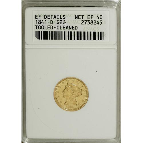 <B>1841-D $2 1/2 --Tooled, Cleaned--ANACS. XF Details, Net XF40.</B></I> Variety 2-C. The reverse field has been tooled above the eagle and above the arrowheads, and those areas have an unnaturally bright appearance. Abraded near the profile and on the base of the neck. A miserly 4,164 pieces were struck for this early Dahlonega issue.<BR><BR><b>Shipping:</b> Coins & Currency (<a target="_blank" href="http://www.heritageauctions.com/common/shipping.php">view shipping information</a>)