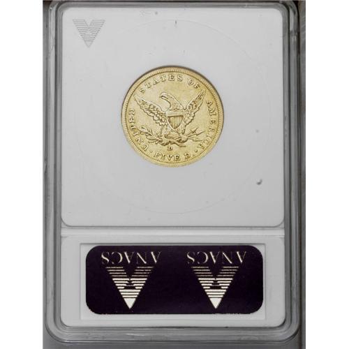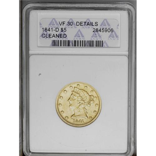 <B>1841-D<$5> Small D--Cleaned--ANACS. VF30 Details.</B></I> Variety 5-D. A chemically cleaned and moderately abraded No Motto example that shows the expected softness of strike on portions of the designs. <BR><BR><B>Important notice:</B> Heritage usually auctions material at the rate of 200-250 lots per hour. On some occasions eBay Live bid software or the Internet may not be able to keep up with the pace of the auction. We recommend placing a realistic absentee bid now as insurance to avoid disappointment. Occasionally the auctioneer may eliminate or reject an eBay Live bid, and the auctioneer may also reopen a lot after the close of the eBay live bidding (usually because we missed an audience bid), and may reject your bid even if it shows you as the winning bidder. By bidding via eBay Live, you agree that Heritage may award the lot to another bidder at its sole discretion under the circumstances described above or any other reasonable circumstances. Since eBay bids are not shown to us until we open the lot on the floor, we treat those bids just like floor bids. In most cases the floor responds before the eBay bid is presented to us, due to Internet lag time, so for consistency we have made it a policy that floor bids are always considered first over tie eBay live bids. Also please note that all Heritage lots purchased through eBay Live carry a 20% Buyer's Premium. Please make sure you read the Terms and Conditions before you bid. This lot is being auctioned in conjunction with a live floor auction by Heritage Galleries & Auctioneers. All final auction and invoice information will be supplied by Heritage Galleries & Auctioneers, and all other information should be considered preliminary. Lot:2659 <BR><BR><B>Winning Notification and Billing:</B> After the FINAL session in this auction is complete, Heritage will send e-mail and snail mail invoices. This process normally takes several days. All final auction and invoice information will be supplied by Heritage Galleries & Auctioneers, and all other information should be considered preliminary. <BR><BR>This auction will be conducted on a live auction floor and over the Internet through eBay Live. If you choose to place an absentee bid, please take a moment to <font color='#0000ff'><u><a href='http://pages.ebay.com/liveauctions/help/before/laabsentee.html'>learn how eBay Live absentee bidding works</a></u></font><font color='#000000'>