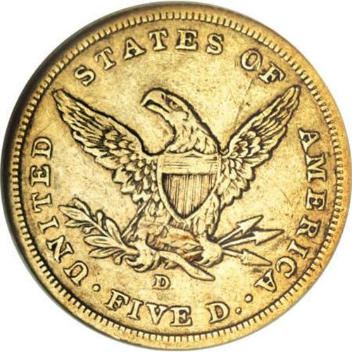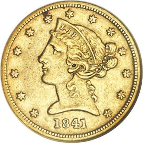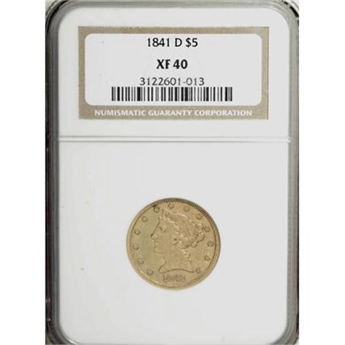 <B>1841-D $5 Small D XF40 NGC.</B></I> Variety 5-D. This green-gold Dahlonega representative has moderate wear and only a single mentionable mark, found near the O in OF. A so-called "Compass Point" reverse with a broken second vertical shield stripe, as made.<BR><I>Ex: Greenwich Collection (Bowers and Merena, 1/91), lot 154.</B></I><BR><I>From The John Stimson, Sr. Collection, Part Two.</B></I><BR><BR><B>Coin Engraver:</B> Christian Gobrecht<BR><BR><b>Shipping:</b> Coins & Currency (<a target="_blank" href="http://www.heritageauctions.com/common/shipping.php">view shipping information</a>)